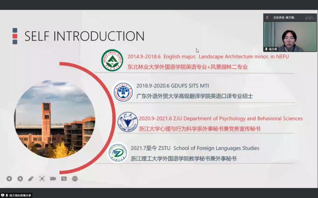 杨万祺,中共党员,万象城娱乐awc线路2018届英语专业毕业生本科期间积极参加各类学科竞赛,曾获万象城娱乐awc线路三好学生、优秀毕业论文、特等奖学金。毕业后,她被推免至广东外语外贸大学高级翻译学院英语口译专业,并获得了CATTI二级笔译证书、上海外语高级口译证书。