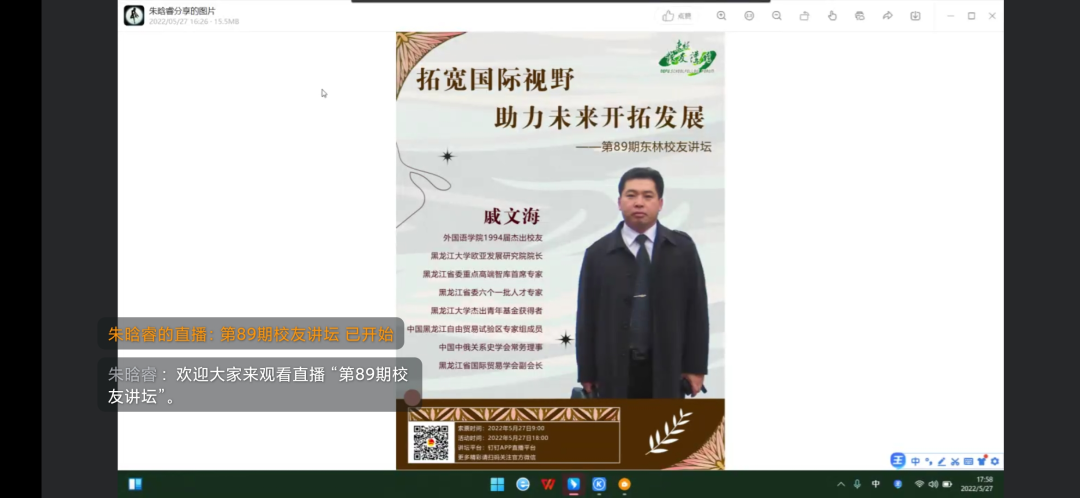 2022年5月27日18时,黑龙江大学欧亚发展研究院院长、东林杰出校友戚文海教授受邀做客万象城娱乐awc线路第89期东林校友讲坛。本次讲坛以“拓宽国际视野,助力未来开拓发展”为主题,以全球化的视角为同学们未来的发展指明方向。