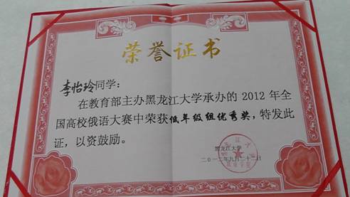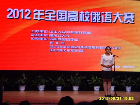 由教育部主办,黑龙江大学承办的2012年全国高校俄语大赛于9月20日——23日在黑龙江大学隆重举行。我校俄语系共派出3名学生参加了这次大赛。其中李怡玲同学在初赛中脱颖而出,进入前20名,从而取得了复赛权,并获得本次大赛的优秀奖。这是我校俄语专业学生在全国高校俄语大赛中首次进入复赛,实现了零的突破。。