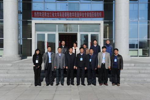 大学英语课程教学质量评估专家和校院领导在行政楼合影留念