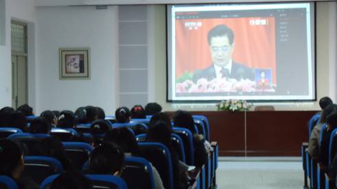 2012年11月8日上午9点,万象城娱乐awc线路在多功能厅组织部分教工党员、学生党员收看了十八大开幕盛况。