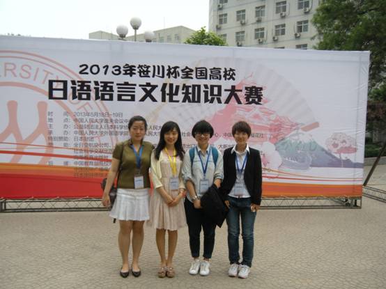 由日本财团赞助、日本科学协会和中国人民大学主办的“2013年笹川杯全国高校日语语言文化知识大赛”于5月17日至19日在中国人民大学举行。我校万象城娱乐awc线路日语系青年教师文慧超带领2009级王春冬、林津熙、肖宇凡三名同学参加了比赛。我校选手从来自全国的60支参赛队、近200名选手中脱颖而出,凭借默契的配合和优异的表现以复赛小组第一的成绩进入半决赛,成为黑龙江省参赛队中唯一进入半决赛的参赛队,并最终取得了团体优秀奖的佳绩。