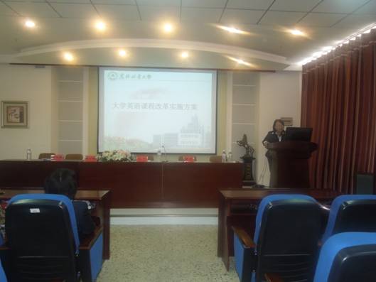 首先,王丹院长作了题为《大学英语课程改革实施方案》的报告,分别从实施背景、总体思路、课程设置、教学模式和评估体系五个方面详细而全面地向大学外语部全体教师解读了大学英语课程改革的具体实施方案。辛淑英书记发表重要讲话,积极动员我院大学外语部全体教师尽快适应大学英语改革,调整心态、正确面对本次改革带来的各种困难,服从学校和学院的各项工作安排。