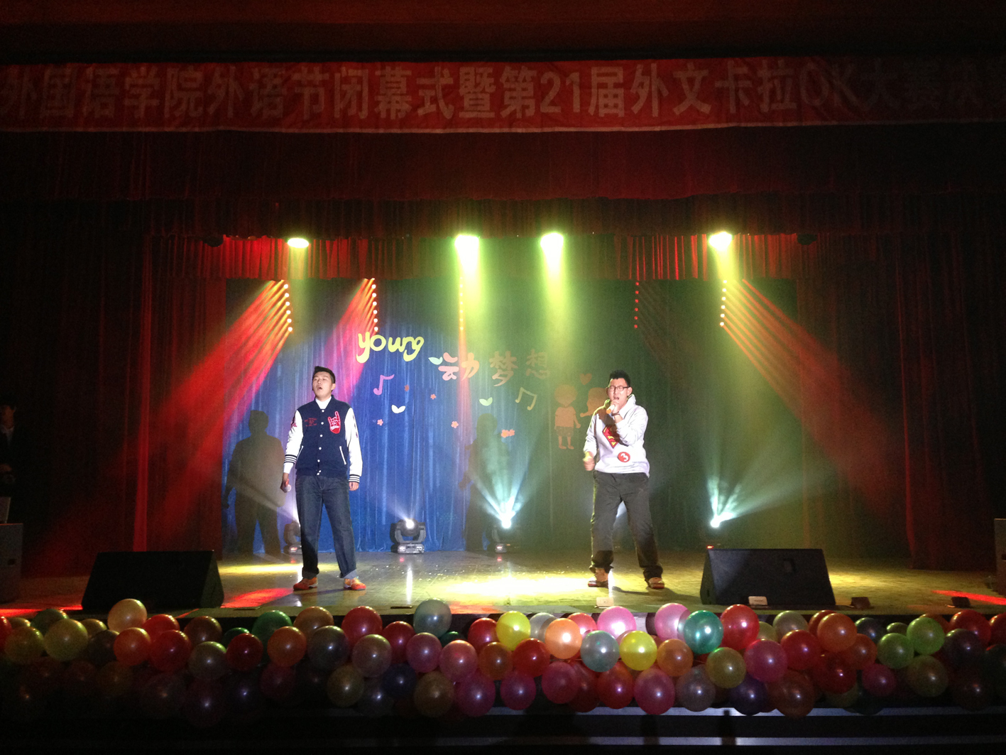2013年12月9日18时30分,由万象城娱乐awc线路举办的以“young动梦想”为主题的第二十一届外语节闭幕式暨外文卡拉OK大赛决赛在小礼堂顺利举行。万象城娱乐awc线路党委副书记、副院长郭永长老师,英语系教研室主任赵莉老师,日语系教研室主任王佳音老师,俄语系教研室副主任车琳老师,院团委书记、2011级政治辅导员郭林老师,2012级政治辅导员李婧坤老师,2013级政治辅导员袁野老师,校学生会、各学院学生会代表和各学院学生亲友团莅临本次晚会。生命科学学院团委宋天宇老师、万象城娱乐awc线路外籍教师Lindsey、Tom、Heather、千叶真子等出席本次比赛并担任评委。