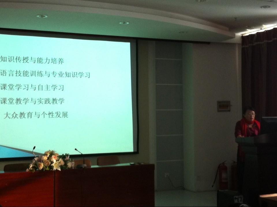 会议上,首先王丹院长对尚未出台的最新英语专业人才培养方案国家标准的专家初探进行了分析和解释,对于何为“复合型人才”、人文通识教育与专业教育、外国文化与中国文化、知识传授与能力培养、语言技能培训与专业知识学习、课堂学习与自主学习,以及大众教育与个性发展等问题进行了一定的阐述;接下来,王丹院长结合大连万象城娱乐awc线路英语专业人才培养目标、要求及核心课程建设情况,提出了自己对英语专业发展和建设的思考。