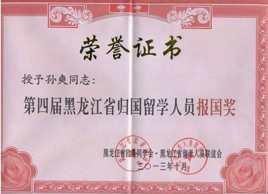 为进一步弘扬留学报国的优良传统,激励留学人员在黑龙江省“科教兴省”、“人才强省”的伟大事业中不断建功立业,表彰广大会员心系家乡、报效祖国的拳拳爱国之心和先进事迹,特为在留学报国、建设龙江中做出突出贡献的留学人员颁发了“第四届黑龙江省归国留学人员报国奖”,我院孙爽副院长获此殊荣,并作为代表上台领奖。(李志坤)