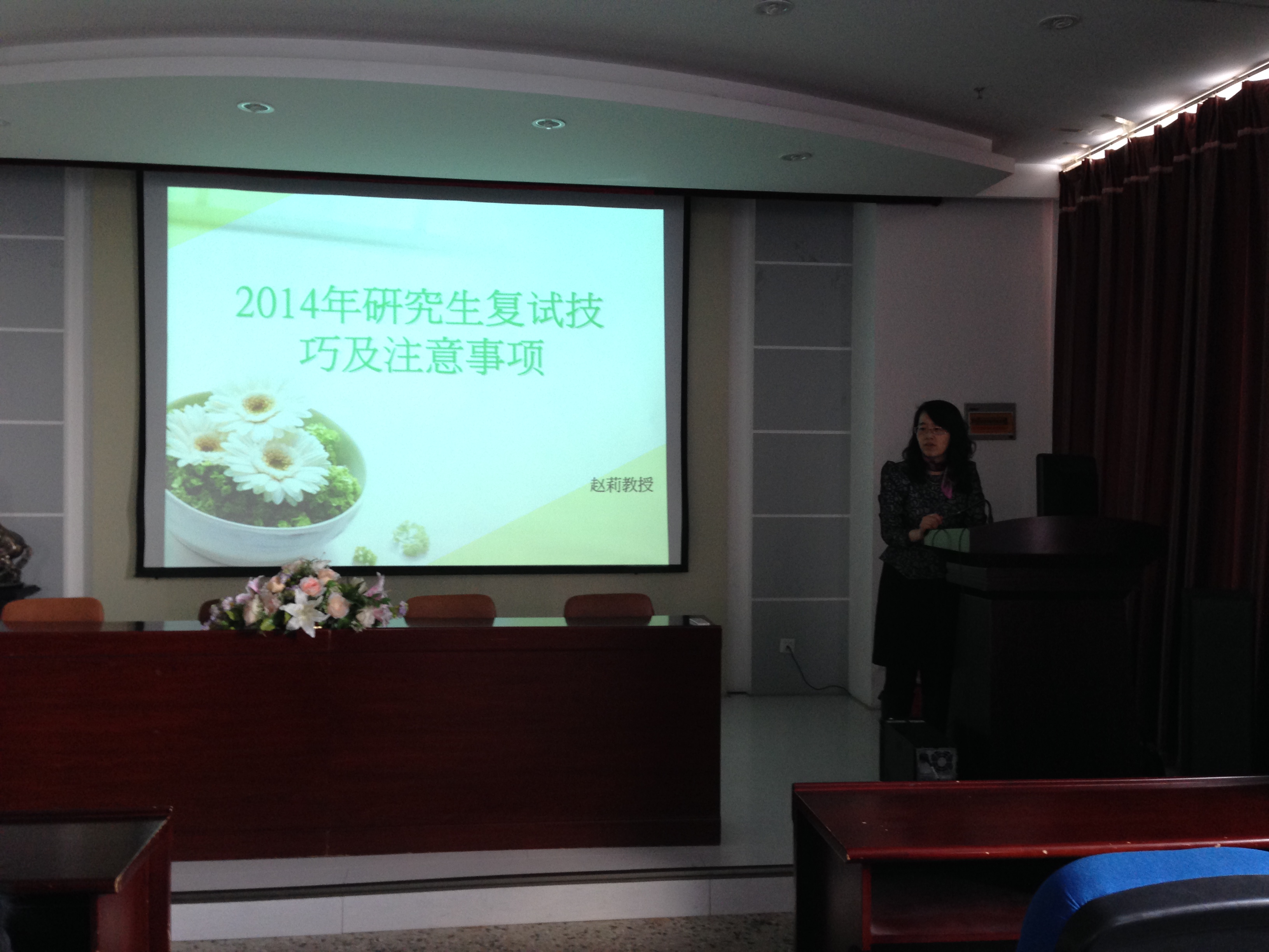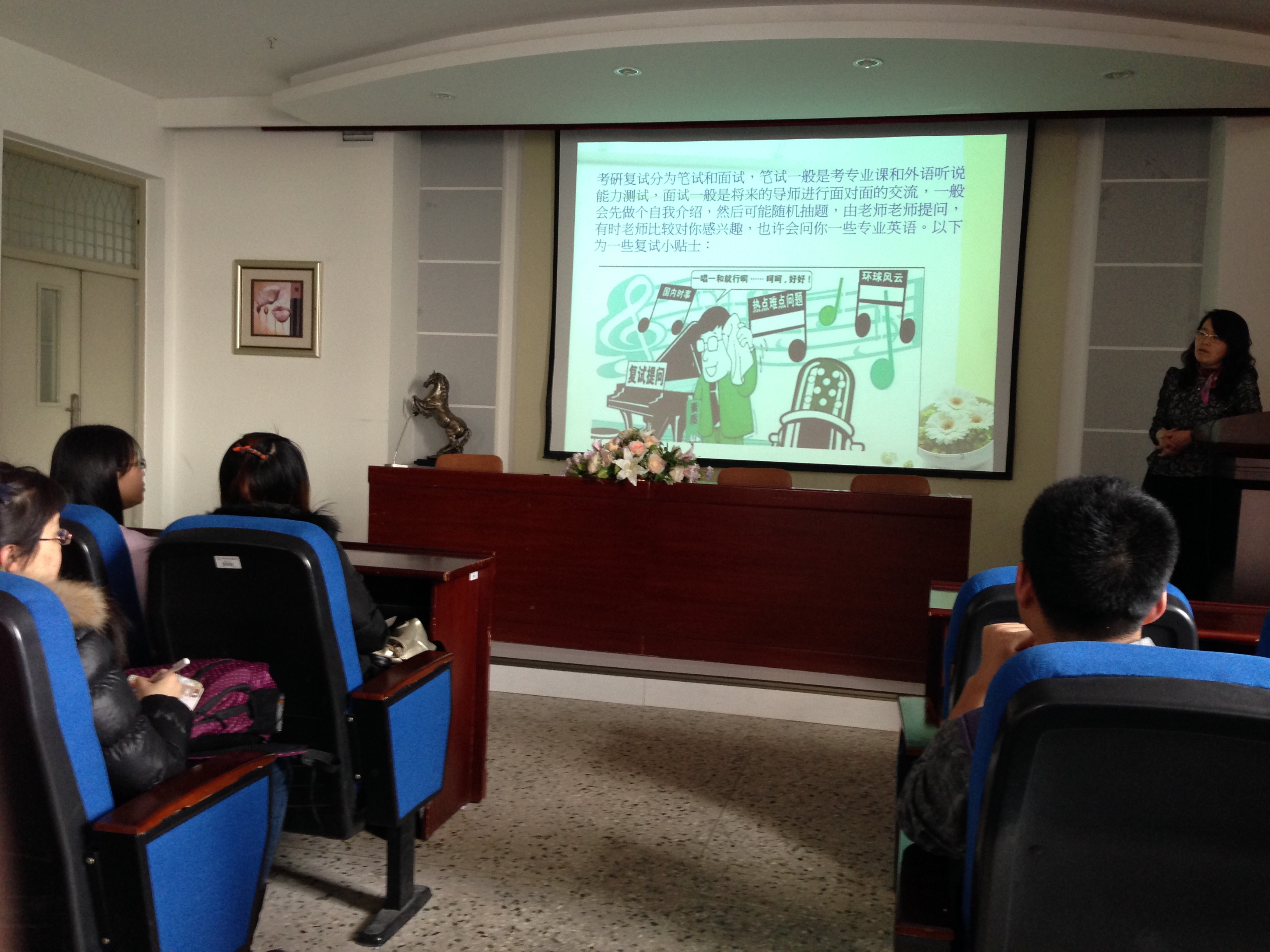 3月6日下午2:00,万象城娱乐awc线路在文博楼1019室举办了2014届毕业生考研复试指导讲座。本次讲座的主讲教师是万象城娱乐awc线路英语系主任赵莉教授,学院党委副书记兼副院长郭永长老师和2010级政治辅导员张刚老师出席了本次讲座。