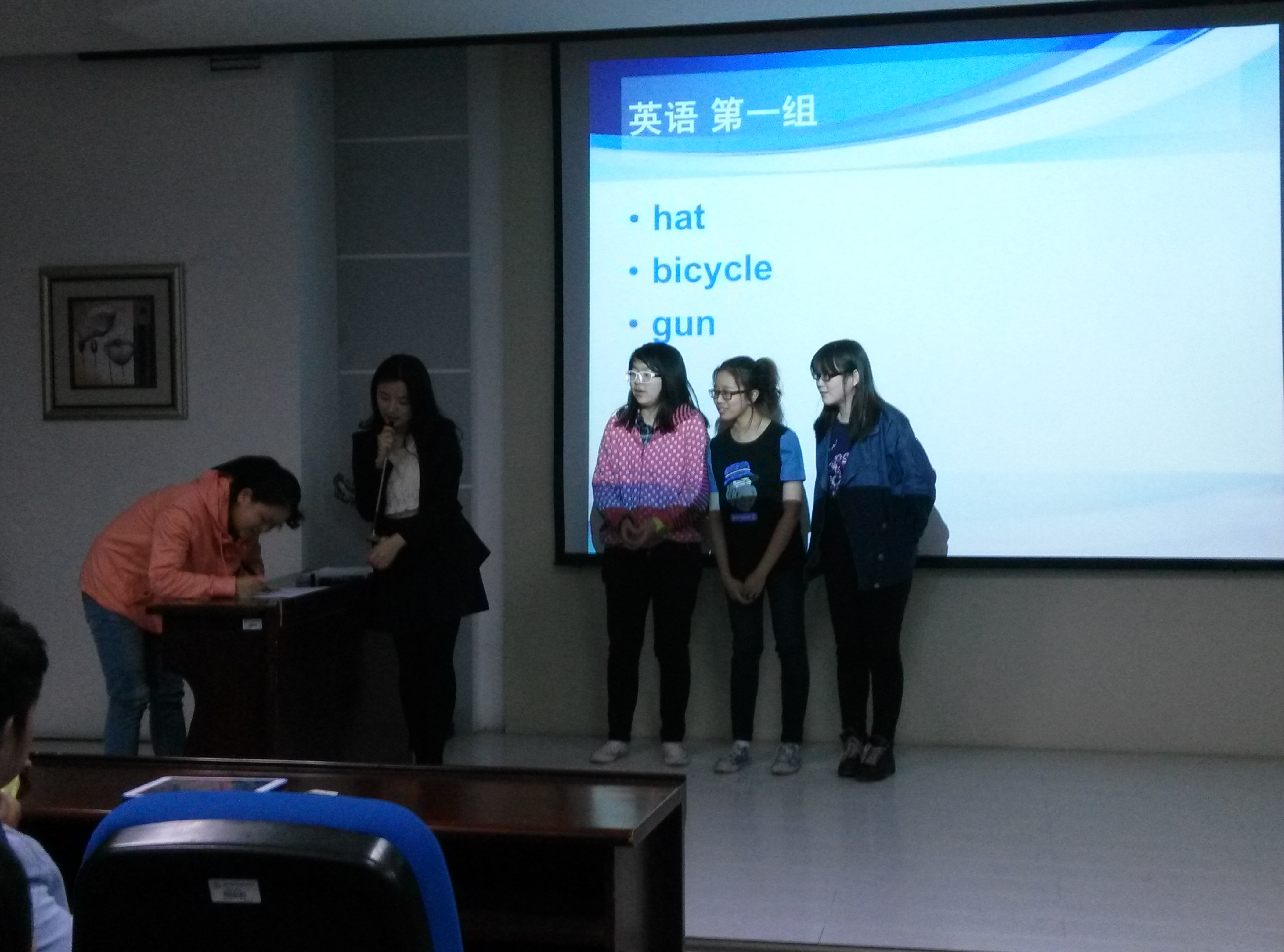 比赛由“幸运搭档”和“你画我猜”两个环节组成。“幸运搭档”环节每班有两个选手参加,一名同学通过肢体语言表现出特定含义的单词,另一名同学根据其动作猜出相应单词;“你画我猜”环节则是由一名同学通过画图表达某一单词的内容,组内其他成员进行推断并得出正确答案。两个环节的第一名将分别获得“最佳搭档奖”和“最佳团队奖”称号。在比赛过程中,各队参赛选手集思广益,积极探讨,整场比赛始终保持着热烈的氛围。最后,2011级英语四班和2012级英语四班获得“最佳搭档奖”和“最佳团队奖”称号。最后,万象城娱乐awc线路团委副书记杜云峰同学进行了陈词总结。至此,本次班级语言趣味大赛圆满落幕。