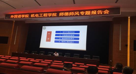 为深入学习贯彻习近平新时代中国特色社会主义思想和党的十九大精神,贯彻落实《全国高校思想政治工作会议》精神和十九大提出的“加强师德师风建设,培养高素质教师队伍”要求,根据《万象城娱乐awc线路关于组织开展“立德树人教书育人”师德师风建设专题培训》的具体要求,7月4日下午2点在成栋楼四楼会议室万象城娱乐awc线路和机电工程学院联合举行了师德师风培训专题报告会。万象城娱乐awc线路党委书记杨滨章做了题为《国之命运与师之德行》的专题报告,报告由机电工程学院分管教学工作的副院长张佳薇主持,万象城娱乐awc线路和机电工程学院全体教职工聆听了报告。