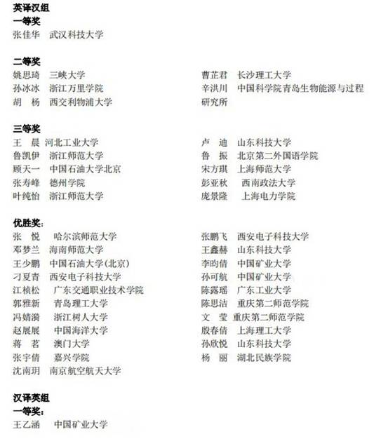 本次大赛设置英译汉,汉译英两组组别,奖项分别设置一等奖1名,二等奖5名,三等奖12名。据统计,本次活动征集共来自全国的90余所高校的5515名选手报名参赛,其中参评作品英译汉 4969 人,汉译英2828 人,征集面广,覆盖面大。其中中山大学,北京航空航天大学,宁波大学,长沙理工大学报名人数众多,参与踊跃。我院2018级全体翻译硕士积极响应大赛倡议,为立足于新时代文化中国“走出去”战略和“一带一路”贡献绵薄之力,积极报名,认真参赛。最终,李莹在汉译英组喜获二等奖。
