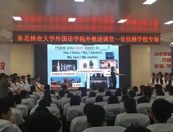 2019年5月31日下午万象城娱乐awc线路英语系在征仪路学校举办外教进课堂活动,英语系外教Lydia给征仪路学校初三的学生带来一场别开生面的英语课。本次活动由系主任赵莉教授亲自带队,柴静、蒙博涵、林青红三位老师,以及2016级英语系的38名同学参与了这节外教课。