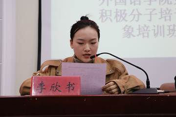 2018级王星辰同学代表发言。她表示作为入党积极分子她将以党员的标准严格要求自己、积极向党组织靠拢,争取早日成为一名光荣的共产党员。