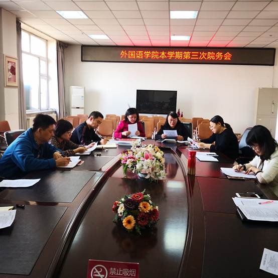 接着,张飚副院长就11月教学工作进行了安排。他从十个方面详细介绍和布置了教学方面工作,重点强调了以下五项工作:一是做好教师、学生座谈会,听取教学情况反馈意见;二是做好出国教师进修汇报会及课程思政经验交流会;三是做好大学生创新创业训练项目中期检查及项目指导工作;四是各系部结合“不忘初心、牢记使命”主题教育开展基层教学组织活动;五是按照国家、教育部、学校要求,思考如何建强专业和建设大外课程。张鸣瑾副院长就11月份科研及研究生教育等10个方面的工作进行了详细布置,重点强调了以下四项工作:一是做好2020年研究生报考咨询、宣传工作;二是做好省哲社规划课题结题工作及省高校成果奖申报工作; 三是做好校级科研工作量申报工作;四是做好2020年研究生全国统考出题等相关工作。