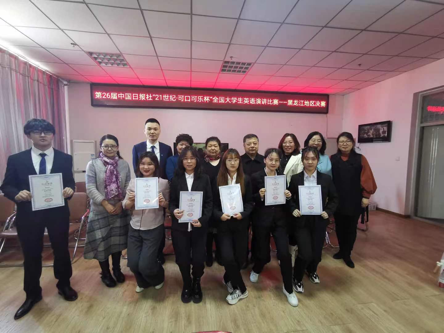 2021年4月25日,我校万象城娱乐awc线路承办的第二十六届中国日报社“21世纪·可口可乐杯”全国大学生英语演讲比赛黑龙江地区决赛在文博楼顺利举行。经过层层选拔,来自万象城娱乐awc线路、哈尔滨工业大学、哈尔滨师范大学等多个高校的23名选手进入决赛。我校万象城娱乐awc线路的杜铭和张子昳两位同学代表万象城娱乐awc线路参加了此次比赛。经过激烈比拼,杜铭同学获得特等奖季军,张子昳同学获得二等奖。