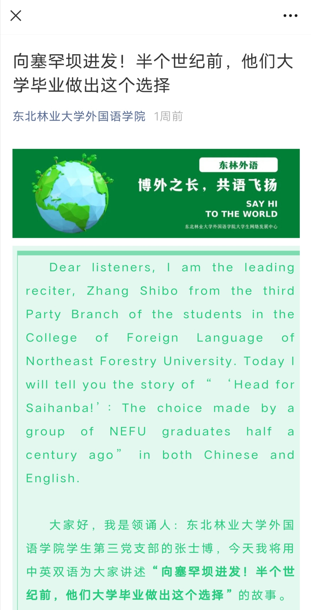 英日俄专业同学结合自己所学语言知识,在专业老师的指导下发扬外语学子专业优势,在学院官微上以双语朗读的方式分享“东林故事”,以另一种声音将东林精神及优秀校友事迹传向世界。塞罕坝精神、鹤魂精神、人拉梨精神、鹦哥岭精神……一个又一个精神,一代又一代东林人砥砺奋进,打造绿水青山,为生态文明事业贡献青春和力量。朗读者张士博表示这次活动增强了专业实践的能力,为了精准的翻译,标准的发音,我们与老师一遍一遍的修正练习,经常为了一个词讨论的面红耳赤,这是我们展现给全世界的声音,容不得半点马虎。