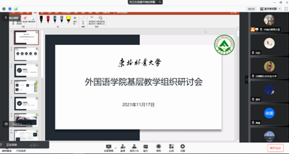 2021年11月17日下午14:00,大学英语第二教研室全体教师在线上参加了本学期第三次基层组织建设日活动,本次活动由教研室主任齐艳主持。