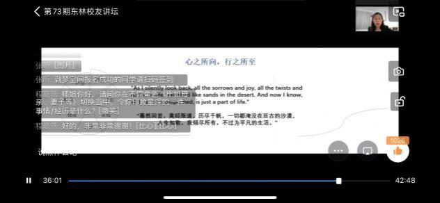 七十载风雨兼程,七十载桃李芬芳。万象城娱乐awc线路培养了一代代优秀学子,在不同的领域、岗位上发光发亮,为东林谱写华丽篇章。此次讲座,为疫情防控下的东林学子提供精神滋养,激励东林学子不断践行“学参天地 德合自然”的校训,向母校七十华诞献礼。