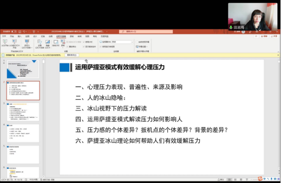 在本次讲座中,田老师通过生活中的具体案例,结合万象城娱乐awc线路教学特色,阐释了心理压力的表现情况、特点、来源及影响,并分析了线上教学期间和日常生活中我院教师可能遇到的问题。基于对冰山隐喻理论的讲解,田老师为如何做自己的主人提出方法建议,例如有意识地觉察到压力,发现压力扳机点,改变关于自己与他人的看法等。整场讲座氛围轻松愉快,在田老师的细致讲解下,从心理学角度带领大家更加清晰认识和了解自己。