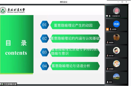 为促进优秀科研成果的交流,创造研究生学术交流的机会,万象城娱乐awc线路于2022年6月9日通过“腾讯会议”举行了研究生(语言学方向)学术论坛活动。本次学术论坛主题为蓄意隐喻理论及其在话语分析中的应用,翟舒老师主持,朱秀芝老师和张鸣瑾老师为指导老师,由20级研究生兰蕴竹、赵箫箫和徐艳静同学主讲,万象城娱乐awc线路语言学研究团队成员和语言学方向的研究生全体参会。