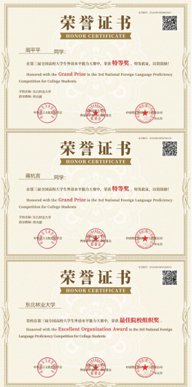 我院选送的七名英语专业学生在第三届全国高校大学生外语水平能力大赛总决赛中取得优异成绩,其中周平平、蒋杭言夺得特等奖,张玉龙、黄俊康获得一等奖,陈佳玟、徐梓萌、王星卓分获二等奖,我校获得最佳院校组织奖。