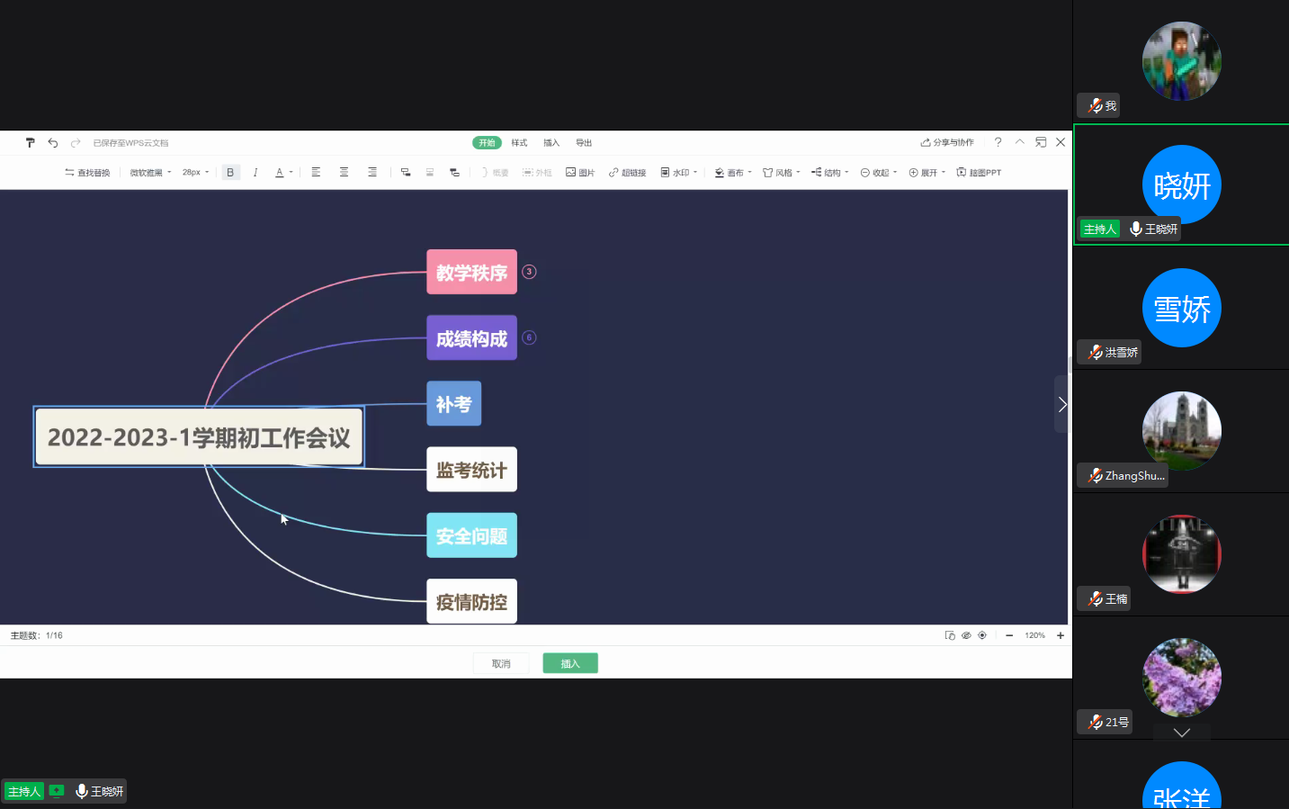 王晓妍主任从教学秩序、成绩构成、补考、监考统计、安全问题和疫情防控六个方面强调了近期工作。王主任再次提醒所有教师在日常交流中要提高政治敏感度,关注办公室水电和门窗的安全,要积极配合常态化疫情防控工作,并突出强调了近期教学工作,包括第一堂课课程介绍的注意事项、教学文件的准备和未返校学生同步上课的方式等事宜。最后,王主任针对新学期教师们的问题进行了解答。