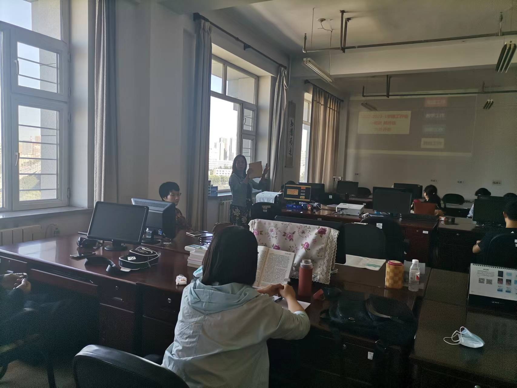 之后王晓妍主任强调了党建工作、教学工作、科研工作等近期工作。首先,王主任通过具体案例再次提醒所有教师要遵守疫情防控要求,正确履职,在教学工作和日常生活中均要严格约束自己的言行。其次,王主任强调常规教学工作,包括上好第一堂课、挖掘辅导学生积极备赛、新版教学大纲的最后修订以及对团队工作的要求等事项,并督促大家对标学院十四五规划,努力缩小差距。针对科研工作,王主任鼓励大家积极申请各级教研项目,发表高质量论文,参加国际学术会议等,并提醒个人研究方向要具有可持续性,与国家和学院规划相一致。最后,王主任还分享了引进人才、专任教师百分比以及研究生导师等信息,鼓励大家不断突破自我,为个人提升及学院发展做出更大贡献。(文/图:舒海英)