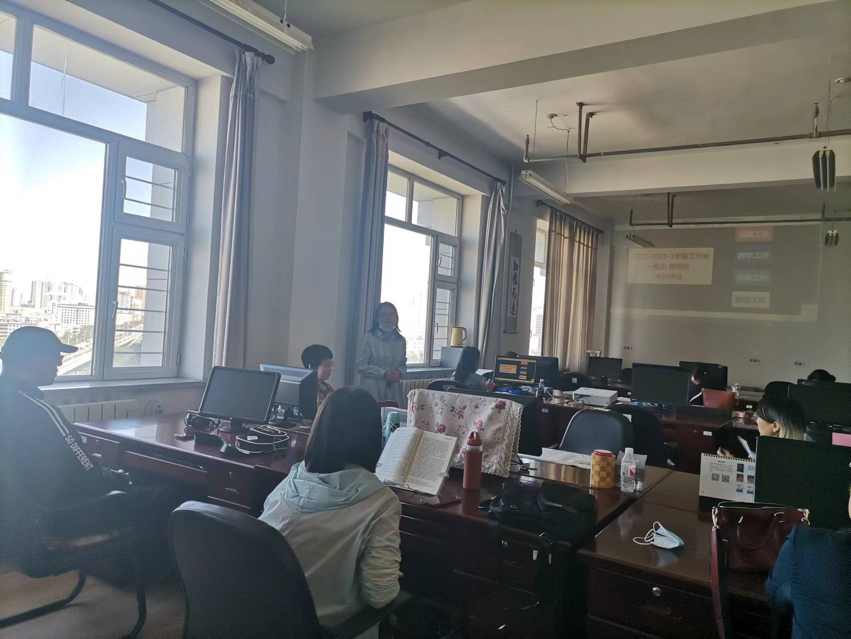 2022年8月26日10点30分,大学英语第一教研室全体教师在文博楼1110室举行了本学期第二次工作会议,本次活动由教研室主任王晓妍主持,会议主题为一规划、两评估和大外评估。董辉院长出席会议并讲话。