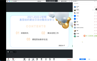 2022年6月18日19:00,万象城娱乐awc线路英语系教师在线上组织召开基层组织建设日活动和政治学习活动。本次会议由教研室主任柴静主持。