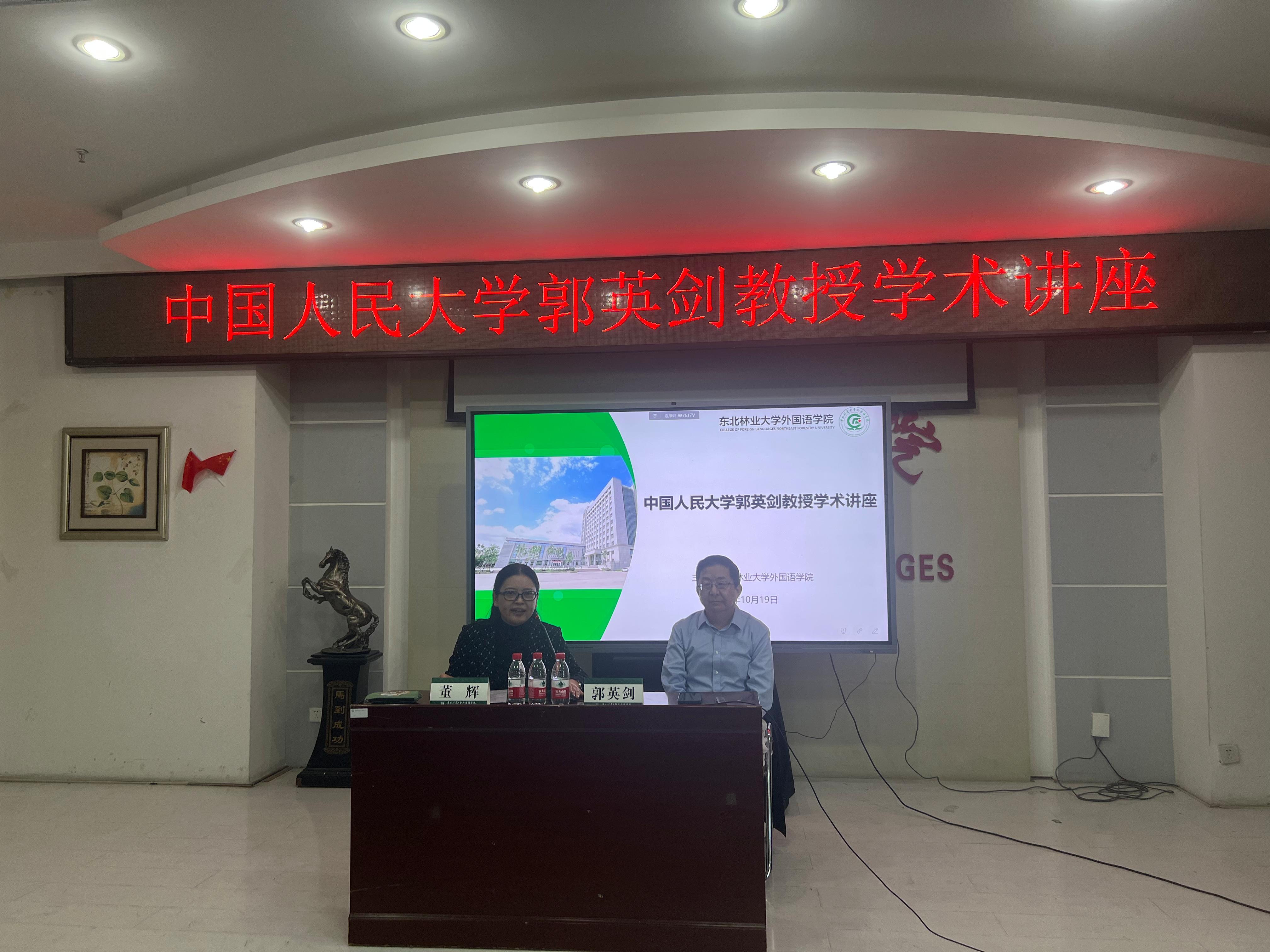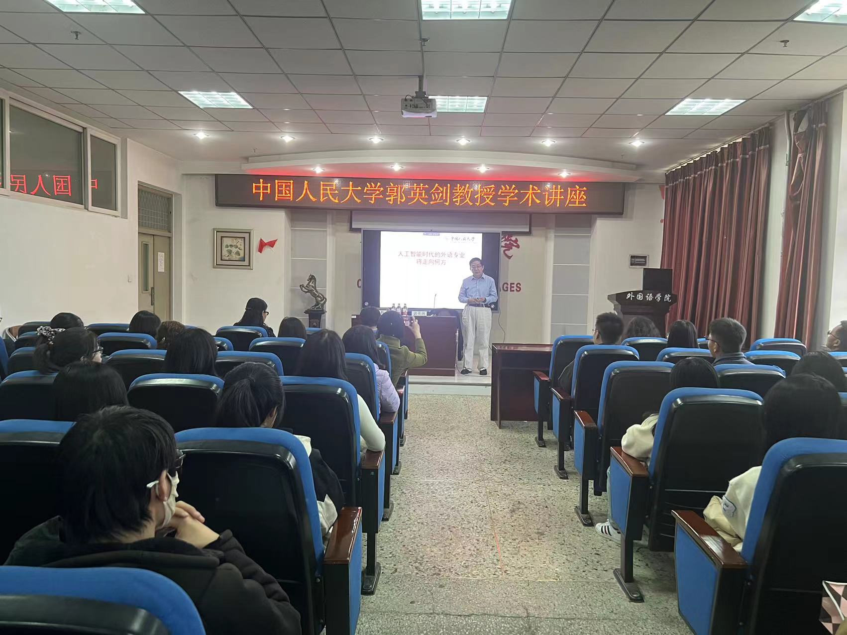 2023年10月19日下午15:30,中国人民大学首都发展与战略研究院副院长、中国人民大学“杰出学者”特聘教授、哈佛大学高级研究学者郭英剑教授莅临万象城娱乐awc线路交流指导,并做了题为“人工智能时代的外语专业将走向何方”的学术讲座。万象城娱乐awc线路师生参加了学术讲座,讲座由万象城娱乐awc线路院长董辉主持。