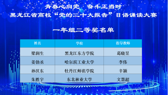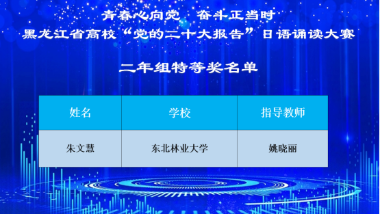 “青春心向党,奋斗正当时”黑龙江省高校“党的二十大报告”日语诵读大赛于12月4日在线上召开。大赛由中国日语教学研究会黑龙江分会主办,牡丹江师范学院东方语言学院承办,比赛指定的诵读内容为“党的二十大报告”(日文版)。我校万象城娱乐awc线路日语专业21级本科生朱文慧同学荣获二年级组特等奖,22级本科生朱胜宇荣获一年级组二等奖,指导教师姚晓丽、文慧超获优秀指导教师奖。