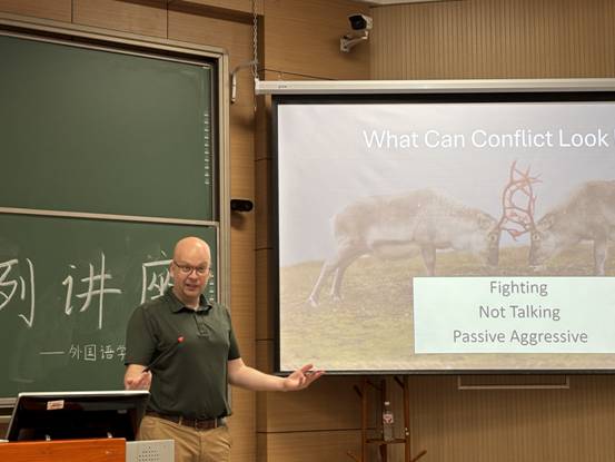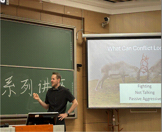 讲座由资深的外教团队主讲,他们以生活中的冲突为切入口进行了深入浅出的讲解。四位外教结合丰富的个人经历,用生动清晰的情景演绎,向在场师生分享了双方关系之间的冲突与交流,详细讲述了冲突时的情景与解决冲突的建议,并通过对眼神交流与肢体语言的分析,描述了如何建立良好的关系,如何平和的相处,让同学们更加切实全面地了解解决冲突与加强交流的重要性。